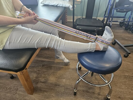 A stretch for your calves to perform while sitting could be to put one of your feet on a chair (you could have a caregiver assist with this as well). Using a belt in your closet, you can make a loop, wrap it around your foot, and pull your foot toward your body. If you are doing this correctly, you should feel a tugging sensation in the back of your calf. I tell patients to hold this stretch for up to 2 minutes for maximum benefit. Then return the foot to the floor, place the opposite foot on the chair, and repeat on the opposite side.